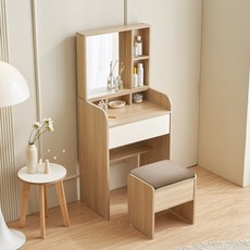오크와 스위트 그레이 색상 조합으로 세련된 느낌을 주며, 접이식 구조와 스툴 포함으로 공간 활용이 뛰어나고 실용적인 수납 화장대 세트입니다.