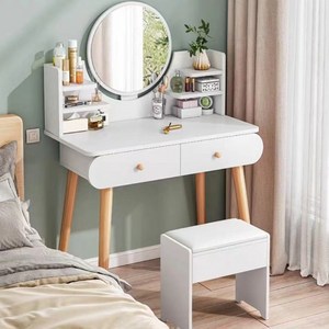 화이트 컬러와 깔끔한 디자인으로 밝고 세련된 분위기를 주며, 멀티 수납형 구조와 거울, 서랍장이 포함되어 실용적으로 사용할 수 있는 화장대 세트입니다.