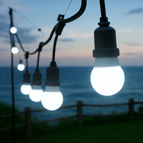 야외용 방수 LED 파티라이트로, 오징어등 소켓과 8W 주광색 전구 5개가 포함되어 테라스, 캠핑, 카페 등 다양한 공간에서 밝고 안전하게 분위기 있는 조명을 연출할 수 있는 제품입니다.