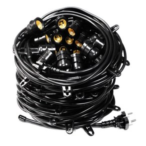 30m 길이의 스트링라이트로, 블랙 전등선과 28분기 오징어등 소켓이 포함되어 LED 전구 미포함 상태로 캠핑, 야외 파티, 테라스 등에서 자유롭게 조명을 설치할 수 있는 제품입니다.
