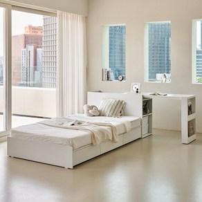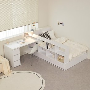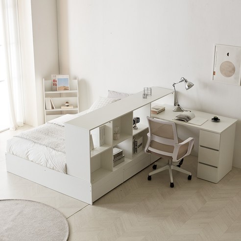 책장과 책상이 결합된 슈퍼싱글 침대 프레임으로, 효율적인 공간 활용과 수납이 가능하며 화이트 색상으로 다양한 인테리어에 어울리는 제품