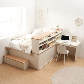 확장형 수납침대와 와이드 책장이 결합된 세트로, 효율적인 공간 활용과 넉넉한 수납을 제공하며 내추럴콤비 색상으로 따뜻한 분위기를 연출하고 방문 설치 서비스가 포함된 제품