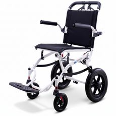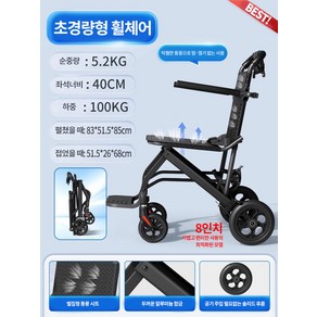 8kg 초경량 알루미늄 프레임으로 제작되어 이동과 휴대가 용이하며 접이식 구조로 차량 적재와 보관이 편리하고 수동 방식으로 안정적인 주행이 가능하며 여행용과 외출 시 사용하기 적합하도록 설계된 장애인 휠체어이며 프로 모델로 내구성과 편의성을 강화함.